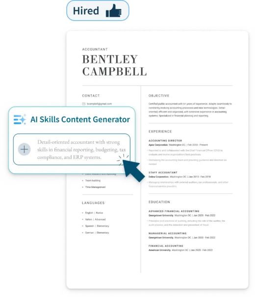 Get a personalized list of skills in seconds based on your target job title with just a click using our intuitive AI Generator.
