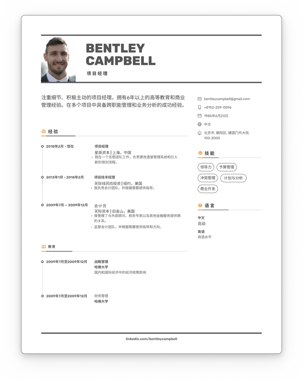 A sure-fire way to build a resume that will impress Chinese recruiters is by employing a Chinese resume template and completing the relevant sections with your personalized profile information.