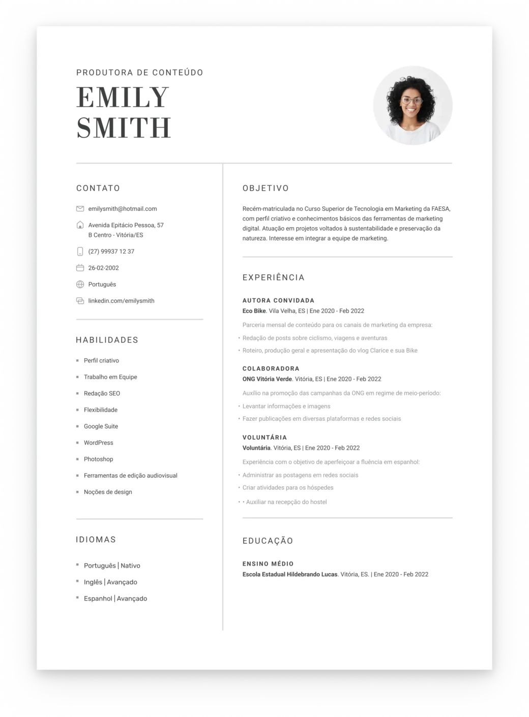 Most American candidates don’t add photos to their resumes as 88% of recruiters will reject your document. However, in Portuguese speaking countries profile photos are normally expected by employers.